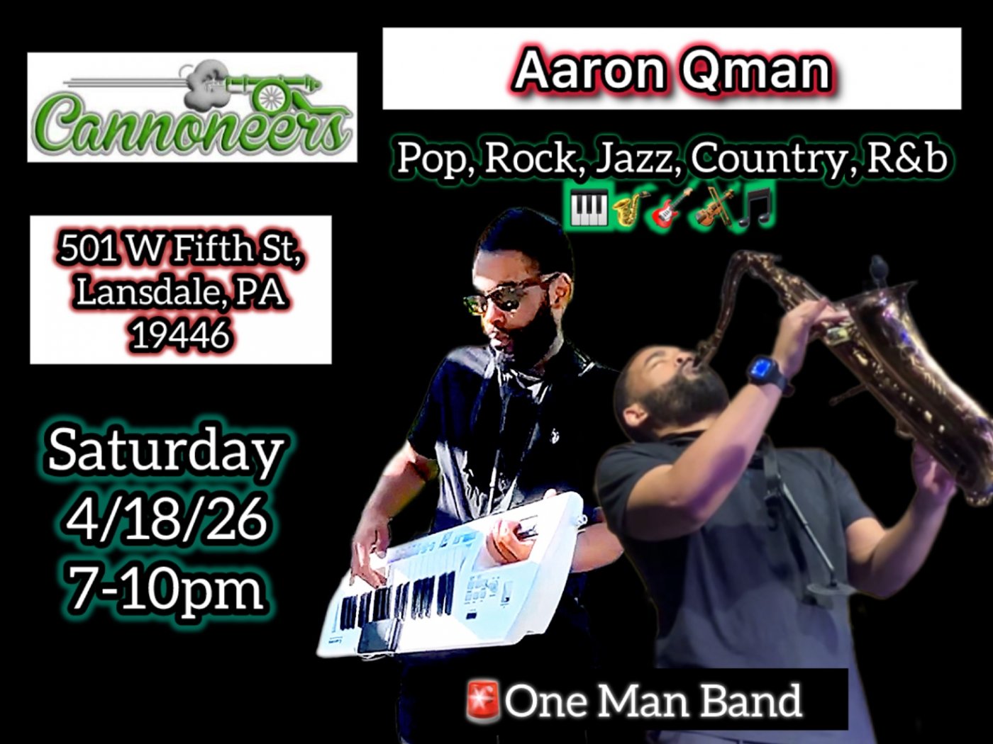 🎤 🎶 Saturday 4/18/26 7-10pm enjoy great food, drinks and music at Cannoneers Sportsmans Club! I will be putting on a one of a kind solo show like no other in this area! Singing and playing over a dozen instruments in one show! Music being a wide variety of Pop, Rock, Jazz, Country and R&B Favorites! 🎹🔥🎵🎺🎻🎸🎷