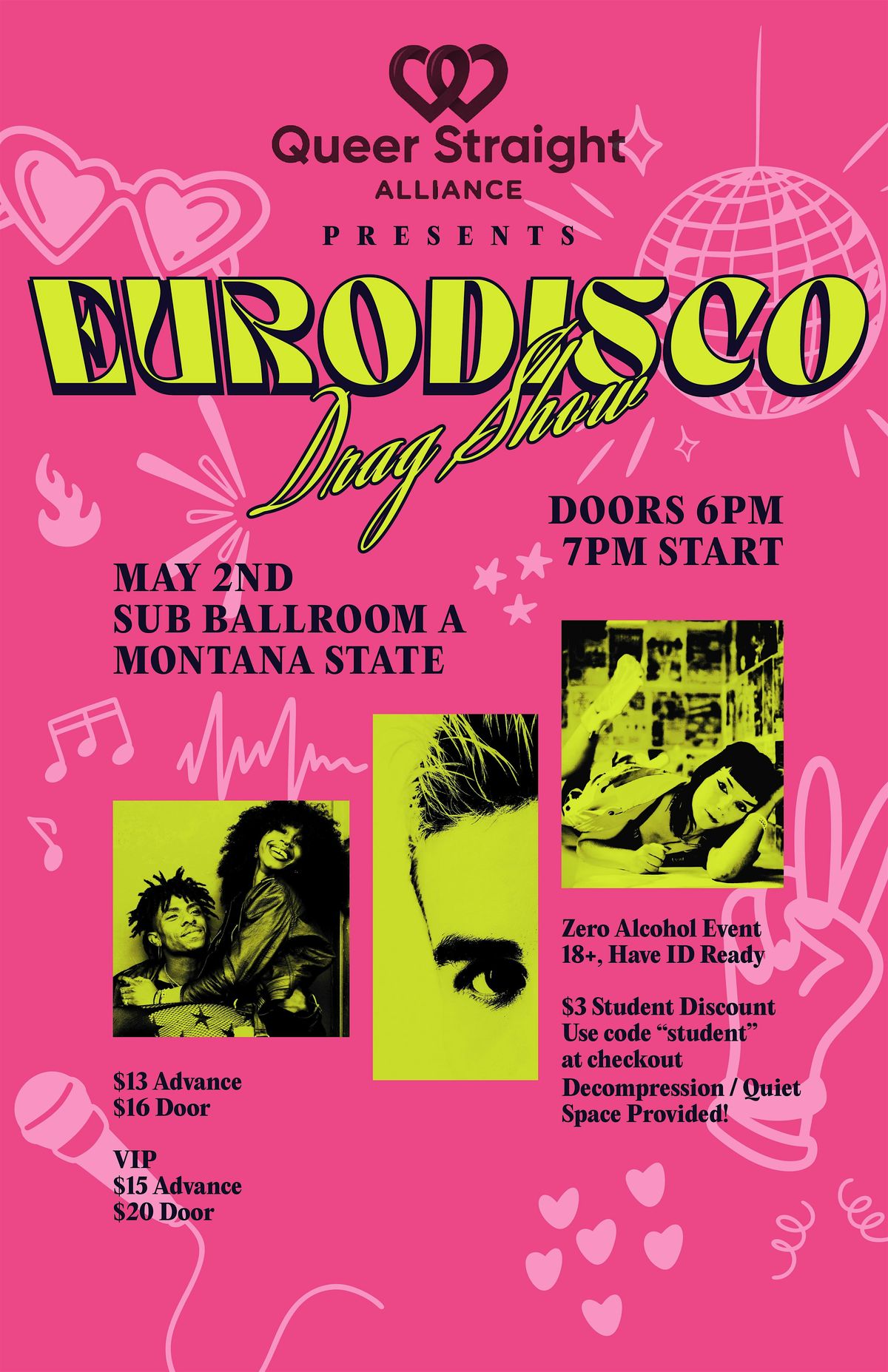 The Queer Straight Alliance at Montana State University is pleased to announce our upcoming drag show! On May 2nd, we will be hosting drag kings, queens, things & more for an 18+ drag show in the SUB Ballrooms on MSU Campus. We'd love for you to join us for a night of Dance, Revelry, Art, and Glamour and we encourage you to dress up in your sparkliest fashion!