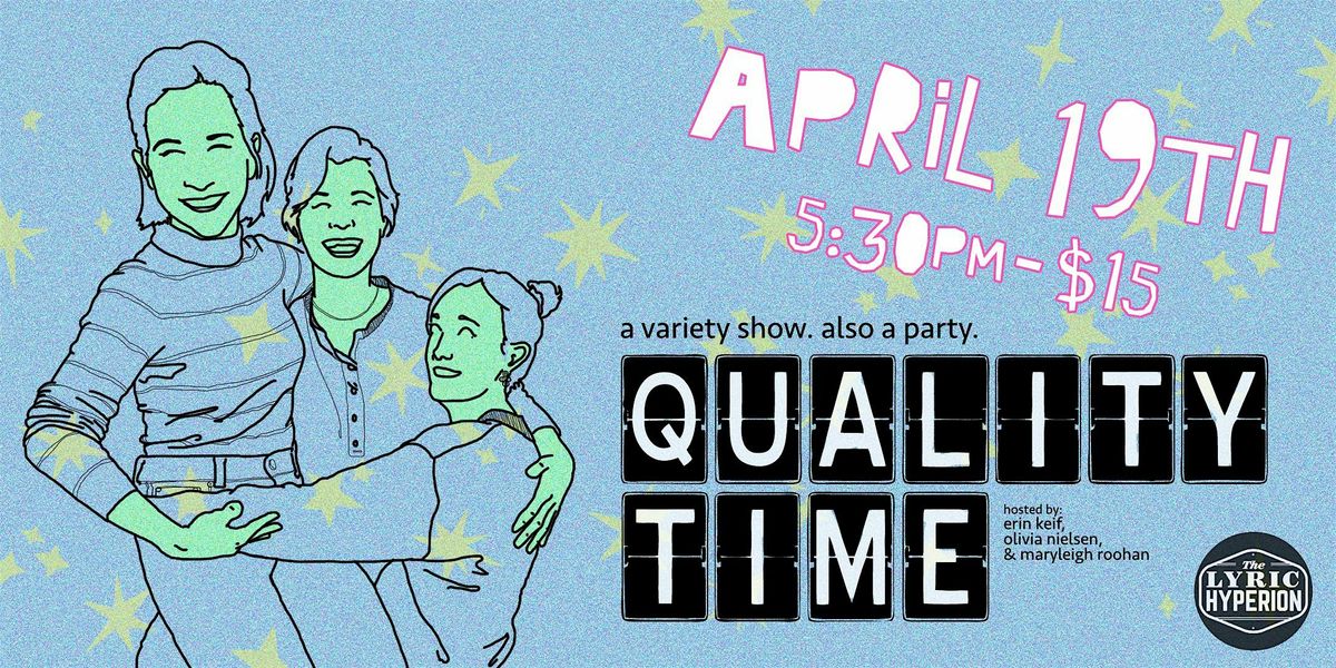 Quality Time is a variety show hosted by Erin Keif (Hey Riddle Riddle), Olivia Nielsen (Second City), and MaryLeigh Roohan. Every month we bring together musicians, improvisers, storytellers, comics and more, who we would love to introduce to each other and to you. Come for a great show, stay for a fun hang.It’s a show. It’s a party. Make a pal. Have a crush.