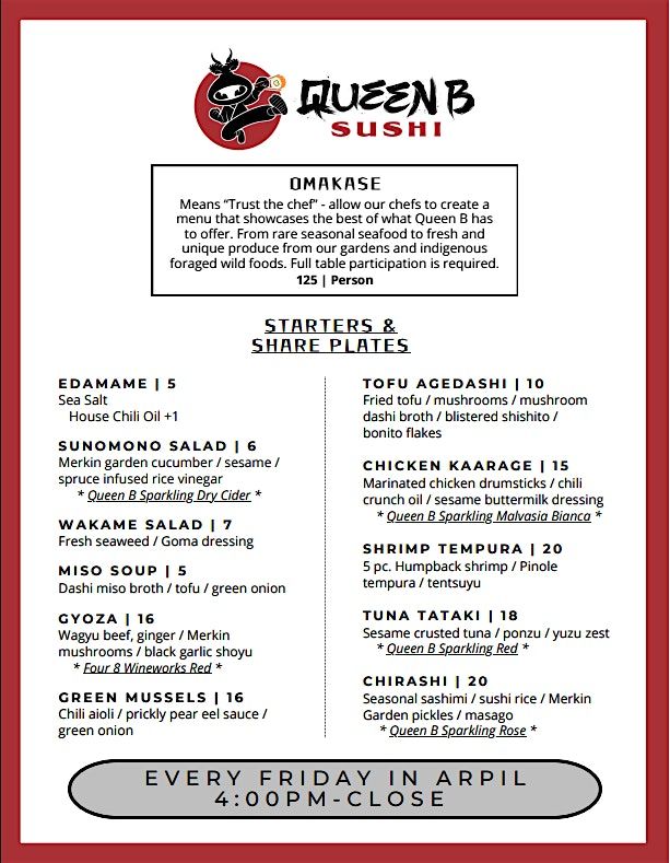 Queen B's Sushi Night returns to the vinyl cafe extraordinaire for Every Friday in April! Fill up on all your favorites, from Tofu Agedashi to Tempura Shrimp Udon!
