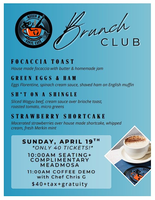 Join your favorite cafe patrons for a delectable Brunch Club menu. Green Eggs & Ham made with a spinach cream sauce, and fresh Merkin mint to top off a Strawberry Shortcake call your name! Don't miss out this April 19th for a refreshing spring menu!