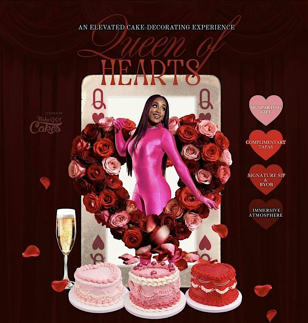 Guests will step into an intimate, elevated atmosphere featuring rich red tones, soft lighting ✨, complimentary tapas, signature drinks 🍸 (BYOB welcome), and a guided cake-decorating experience led by Tasha Got Cakes.