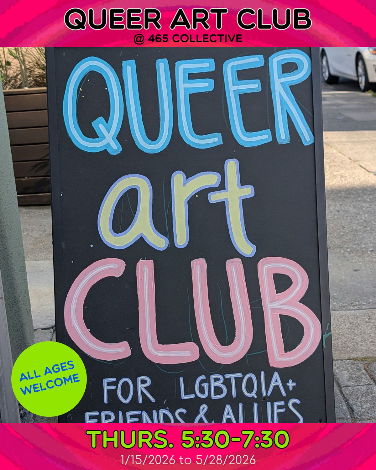 Queerly Complex (@queerlycomplex) and Queer Art Club (@queer_art_club) are pairing up to gather trans-queer-nonbinary Bay Area comrades in a weekly offering spanning generations, identities, expressions, and communities. Every Thursday starting 15 January 2026, 465 Collective’s Gallery and Lounge will be a site of art making, conversating, and organizing rooted in trans-queer-nonbinary mutual care. Queer Art Club takes over the Gallery from 5:30 to 7:30 and will facilitate a different art project each week while also providing additional art supplies so everyone can make what strikes their fancy. Queerly Complex is partnering with Realest Exposure (@realestexposure) / Tray Smith (@trayareal1), Filthy Studios (@filithystudios_)/ Fivestar (@iamfivestar), and Crystal Mason / Tree of Change to offer weekly themed clubs (see below for more details) in the Lounge from 7 to 9pm rooted in their Tree of Change Praxis of cultivating Power-With. Outside will be a Mutual Aid table distributing food, water, clothes, and other basic necessities to anyone who needs them.