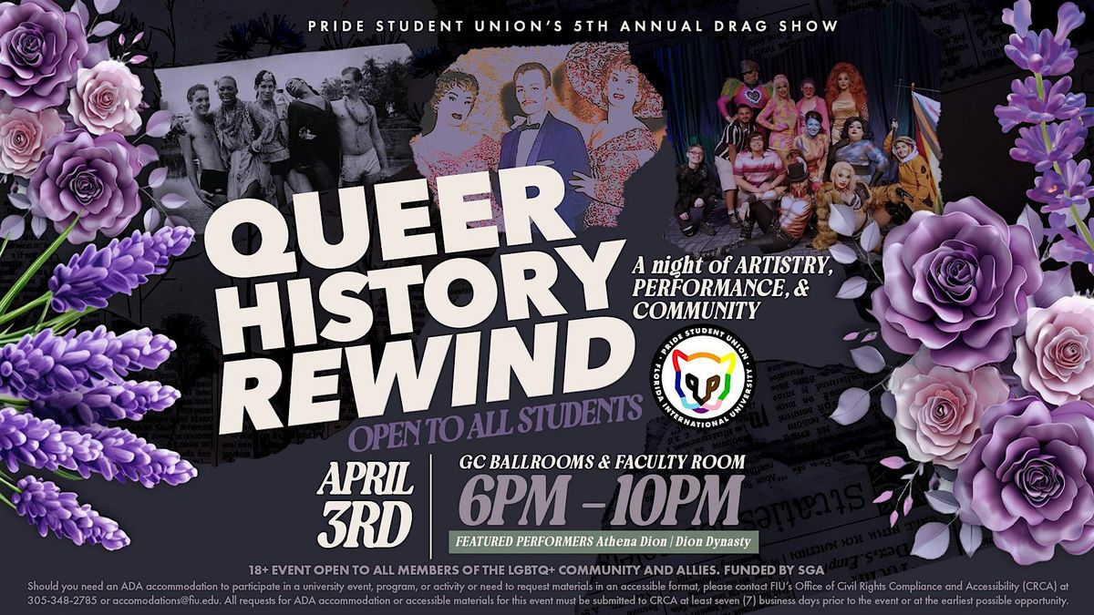 The Pride Student Union at Florida International University is hosting its annual Drag Show for 2026, marking our 5th anniversary celebration. This year’s theme, Queer History Rewind, invites attendees to explore the evolution of drag and queer history, with a special spotlight on South Florida LGBTQ+ history and the legacy of the Pride Student Union at FIU.