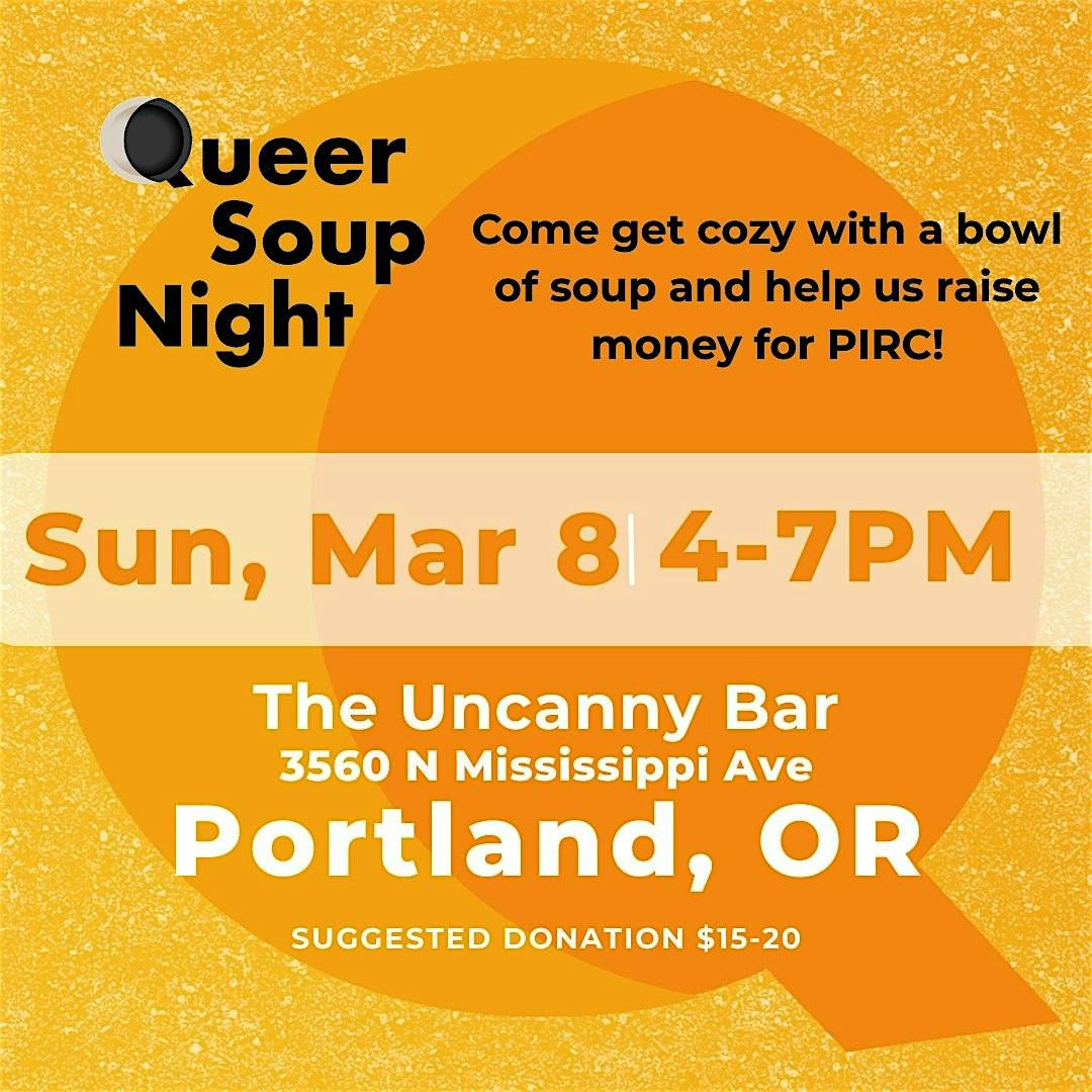 QSN is a party created for queers, by queers. We come together to celebrate queer culinary talent, nourish our bodies and connect with our communities, all while creating a collective impact for local grassroots movements and partners. For this event, we are raising money for PIRC (Portland Immigrants Right Coalition) Oregon. We will have three different kinds of soup made my local chefs (all vegan as Uncanny is a fully vegan bar) Suggested donation is $10-$25 but no one is turned away for lack of funds. Come be in community with queers and allies for a good cause!