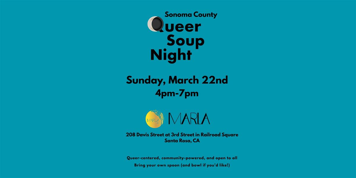 Queer Soup Night returns for another cozy, joy-filled gathering — this time at the beautiful Marla Bakery in Santa Rosa. Address is 208 Davis Street at 3rd Street in Railroad Square, Santa Rosa, CA 95401