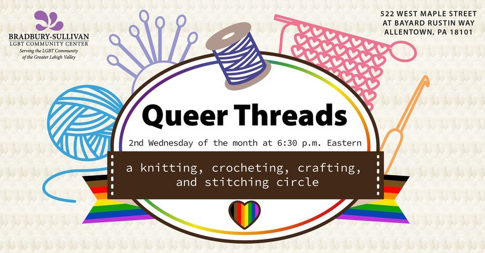 Bradbury-Sullivan LGBT Community Center welcomes your participation in Queer Threads, a knitting, crocheting, crafting, and stitching circle that meets every second Wednesday of the month at 6:30 p.m. Eastern.September's meeting is sponsored by Diakon Adoption & Foster Care. Learn more at diakon.org.