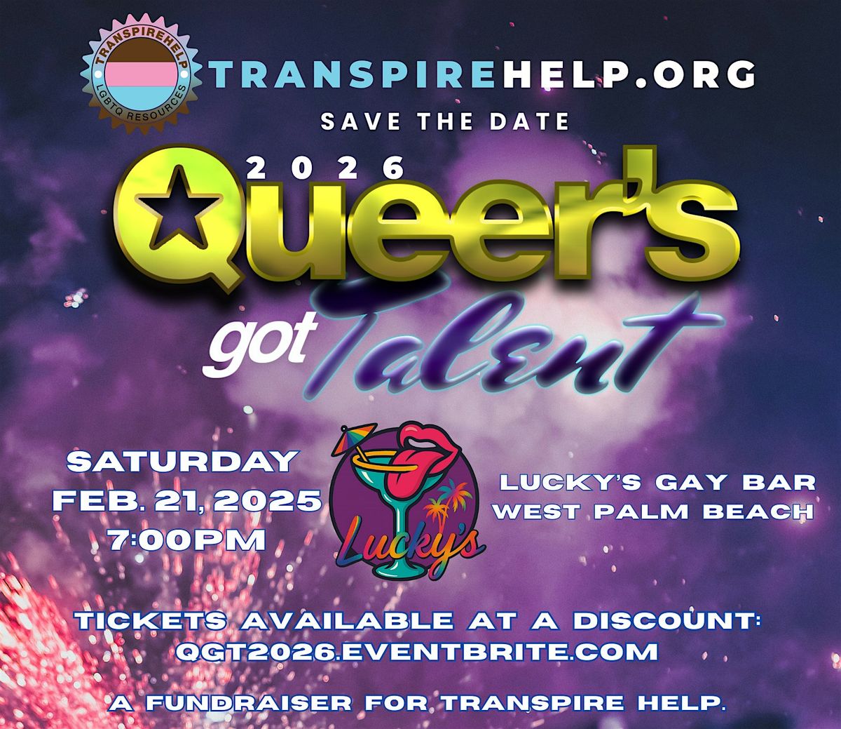 Enjoy a night of laughter, community, and Queer fun while raising funds for an amazing cause. 100% of proceeds go to Transpire Help, a volunteer-led nonprofit serving the LGBTQ+ population in Palm Beach County.