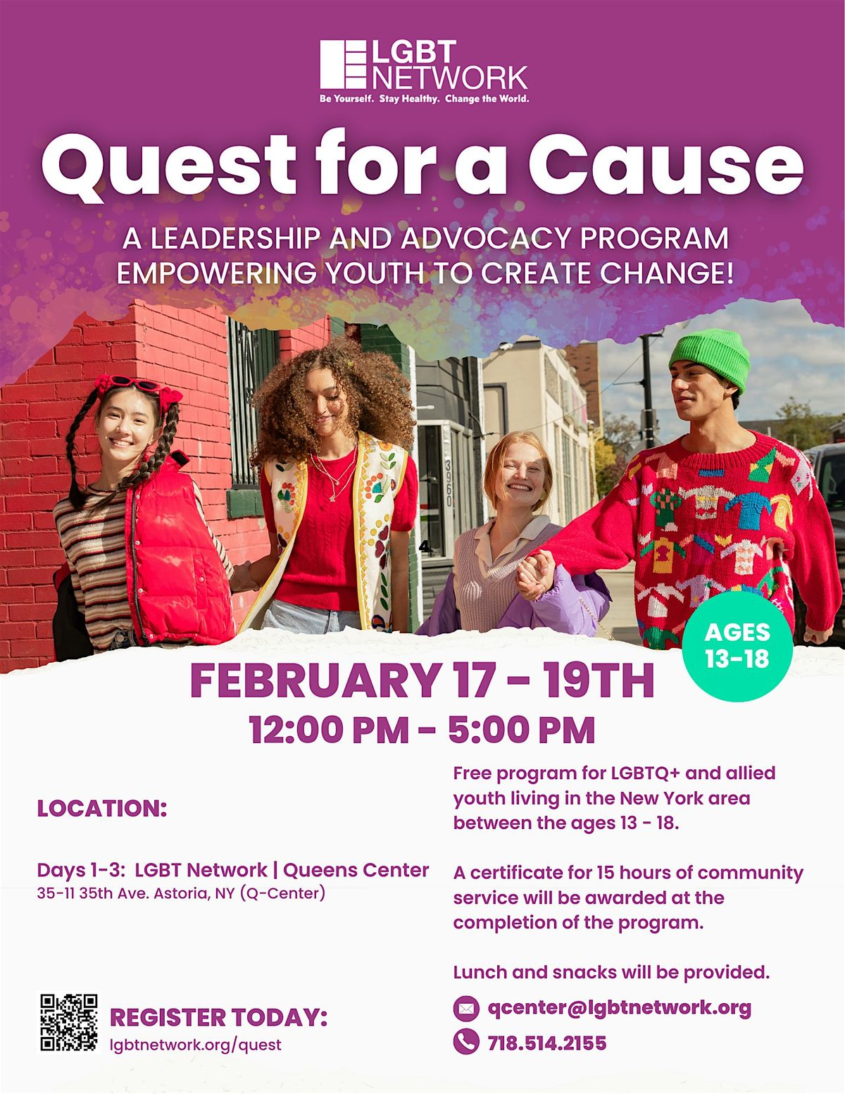 Turn your bright ideas into action with our Quest for a Cause program for LGBTQ+ youth! Quest is a fun-filled, three-day adventure where you will build critical skills such as leadership, research, and advocacy and learn about community leaders through enrichment activities, all while earning community service hours that look great on a resume or college application! This year, the culminating project will be centered around creating an educational poster on an LGBTQ+ advocate of your choice to display online and in your community! Food, snacks, and Metrocards will be provided each day.