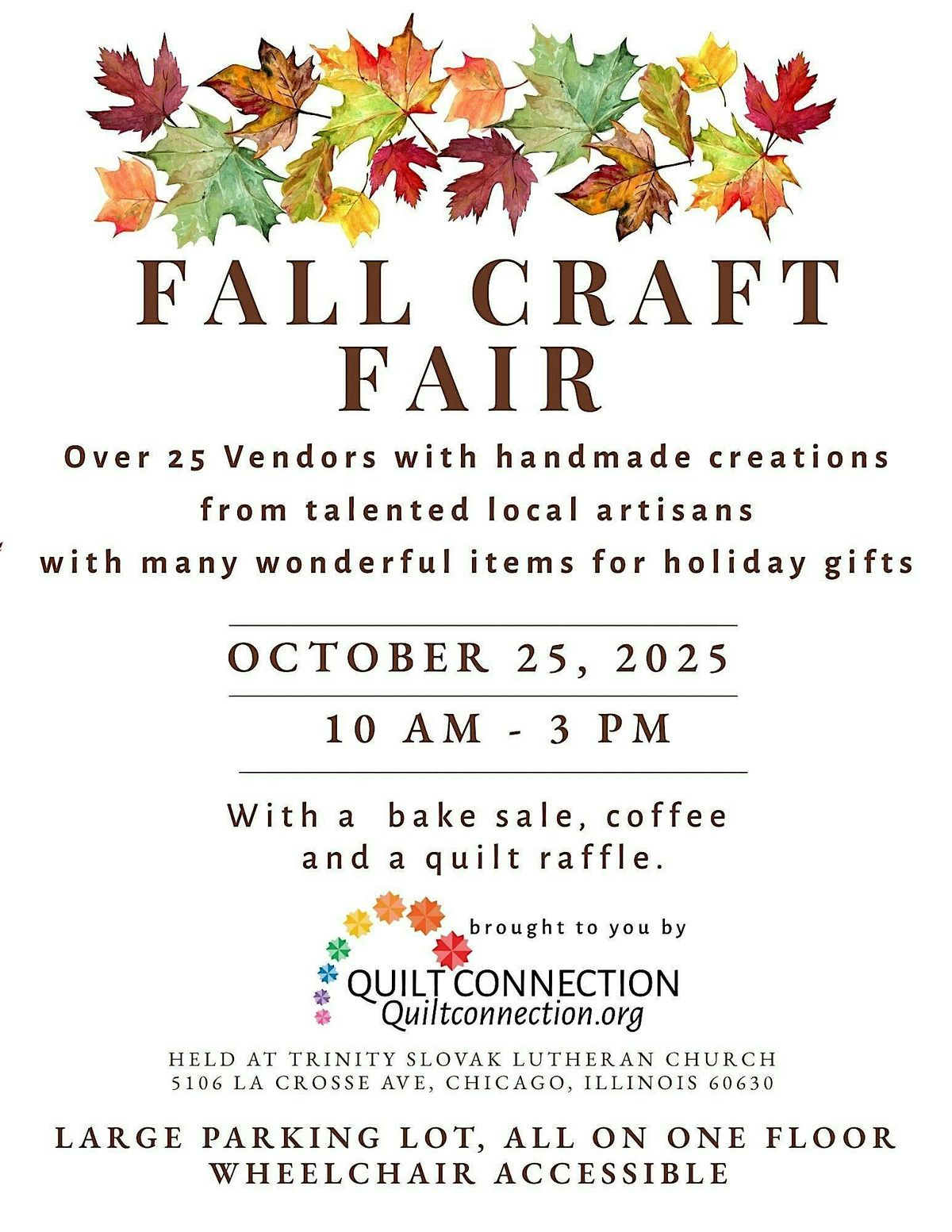 Welcome to the Quilt Connection Fall Craft Fair! Join us at Trinity Slovak Lutheran Church on October 25, 2025 at 10:00 AM (Central Time) for a day filled with creativity and fun. Explore unique handmade crafts, and more from talented local artisans. Don't miss this opportunity to connect with fellow craft enthusiasts and support small businesses. See you there!