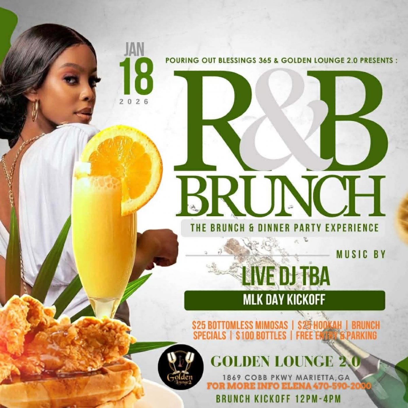 Kick off MLK Day Weekend with R&B Brunch at Golden Lounge 2.0 — the ultimate brunch and day party experience for grown folks who love smooth vibes, good food, and endless mimosas.