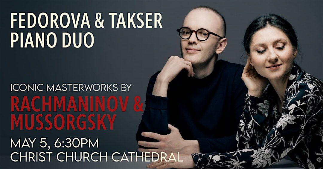 Partners in life and on stage, the Fedorova & Takser Piano Duo – hailed for their extraordinary chemistry and virtuosic brilliance – bring Rachmaninoff’s iconic works and a spectacular two-piano transcription of Mussorgsky’s Pictures at an Exhibition to Vancouver’s Christ Church Cathedral for one unforgettable night on May 5.