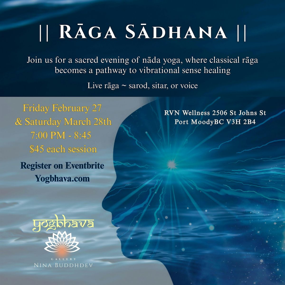 7:15 PM — Seated guided meditation with chakra alignment | Followed by — Rāga immersion (lying down)