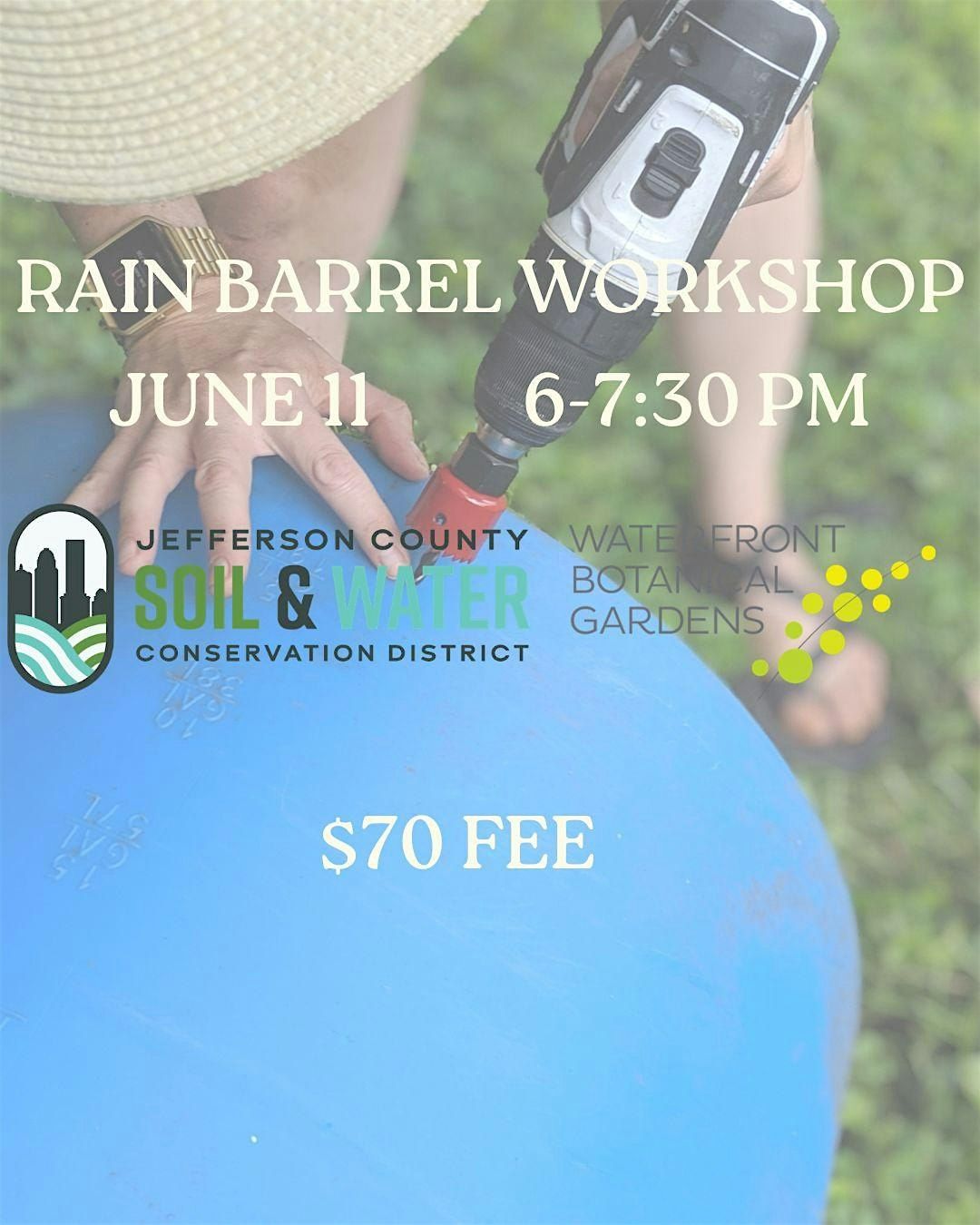 Be prepared to take your rain barrel home after the workshop! These are up to 55 gallon drums that will fit in the back of a standard sedan or hatch-back SUV. The rain barrels cannot be stored for future pickup, so please plan accordingly!