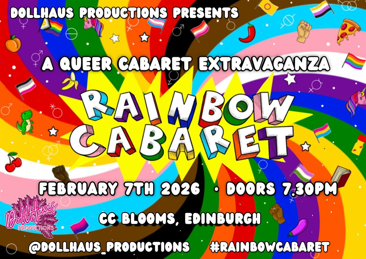 Further down, the event details read “FEBRUARY 7TH 2026 DOORS 7.30PM,”. Below that, the name of venue “CC BLOOMS, EDINBURGH” is displayed. Which is where the event is being held. Details are completed with social media identifiers at the base, showcasing the handle “@DOLLHAUS_PRODUCTIONS” and the hashtag “#RAINBOWCABARET,”
