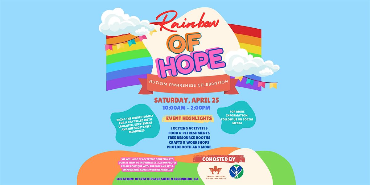 Rainbow of Hope is a colorful, uplifting Autism Awareness celebration you won’t want to miss! Join us in Escondido on Saturday, April 25 from 10:00 AM to 2:00 PM for a fun-filled, family-friendly day packed with exciting activities, creative crafts, interactive workshops, delicious food, and valuable community resources.
