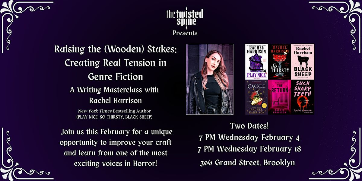 We're thrilled to welcome New York Times bestselling author Rachel Harrison back to The Twisted Spine for a special writing masterclass, Raising the (Wooden) Stakes: Creating Real Tension in Genre Fiction. Join us this February for a unique opportunity to improve your craft and learn from one of the most exciting voices in Horror!
