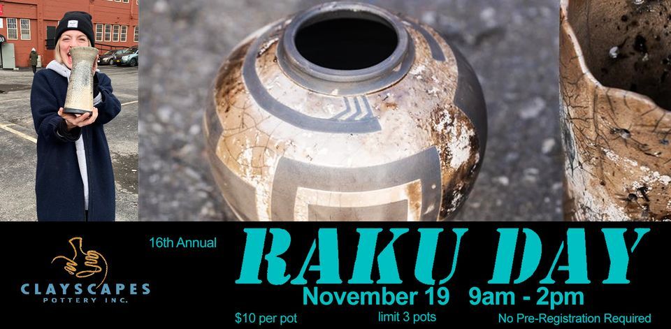 Join us at the 16th Annual Raku Day & Open House at Clayscapes Pottery! Raku Day is a family friendly event.Pots will be available to purchase for $10 each with a limit of 3 per customer. Glaze your own pots, bring them out to the kilns to be fired, and take home that day!