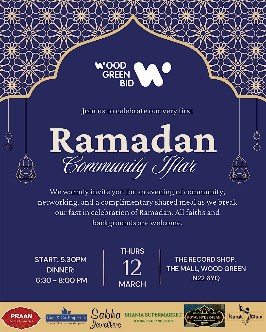 We warmly invite you for an evening of community, networking, and a complimentary shared meal as we break our fast in celebration of Ramadan. All faiths and backgrounds are warmly welcome. Held at the Record shop in The Mall.