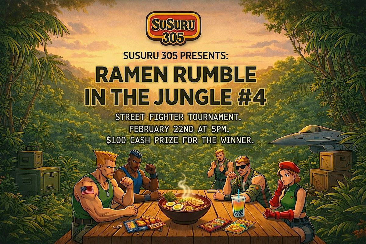 Welcome to the Ramen Rumble In The Jungle#4! 🍜 A Susuru 305 - Street Fighter Tournament happening at Susuru 305! Get ready to Battle it out with your friends while enjoying delicious ramen, exotic snacks, and exotic beverages!