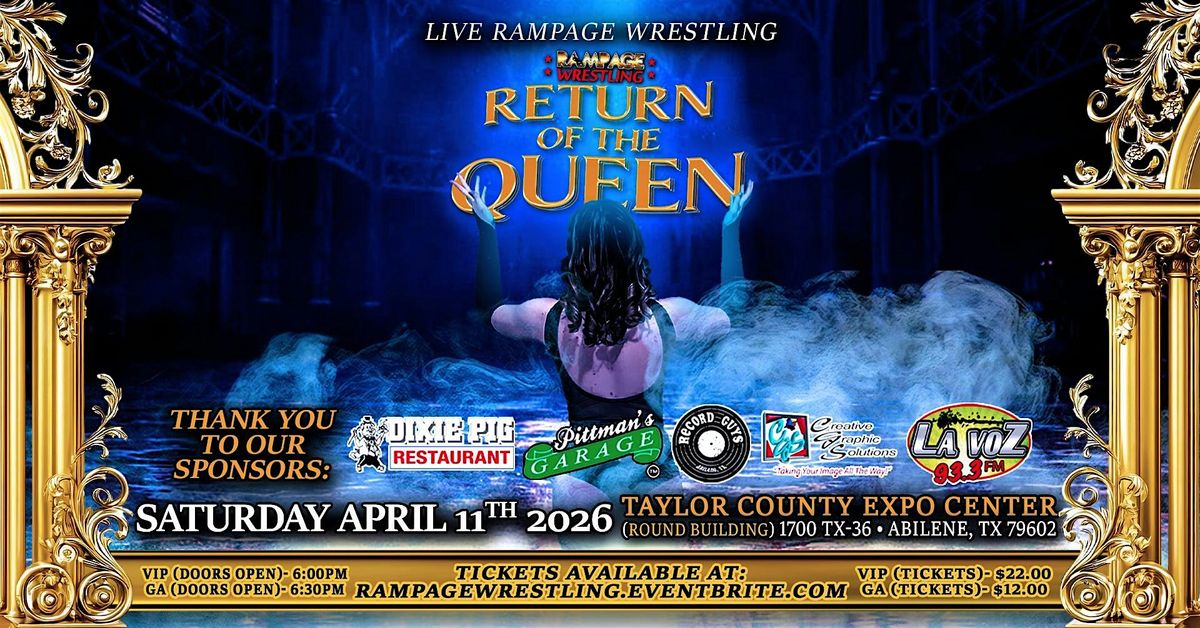 Saturday, April 11, 2026. Taylor County Expo Center ROUND BUILDING, 1700 TX-36, 79602; Abilene, TX. Tickets on sale NOW at RampageWrestling.eventbrite.com!