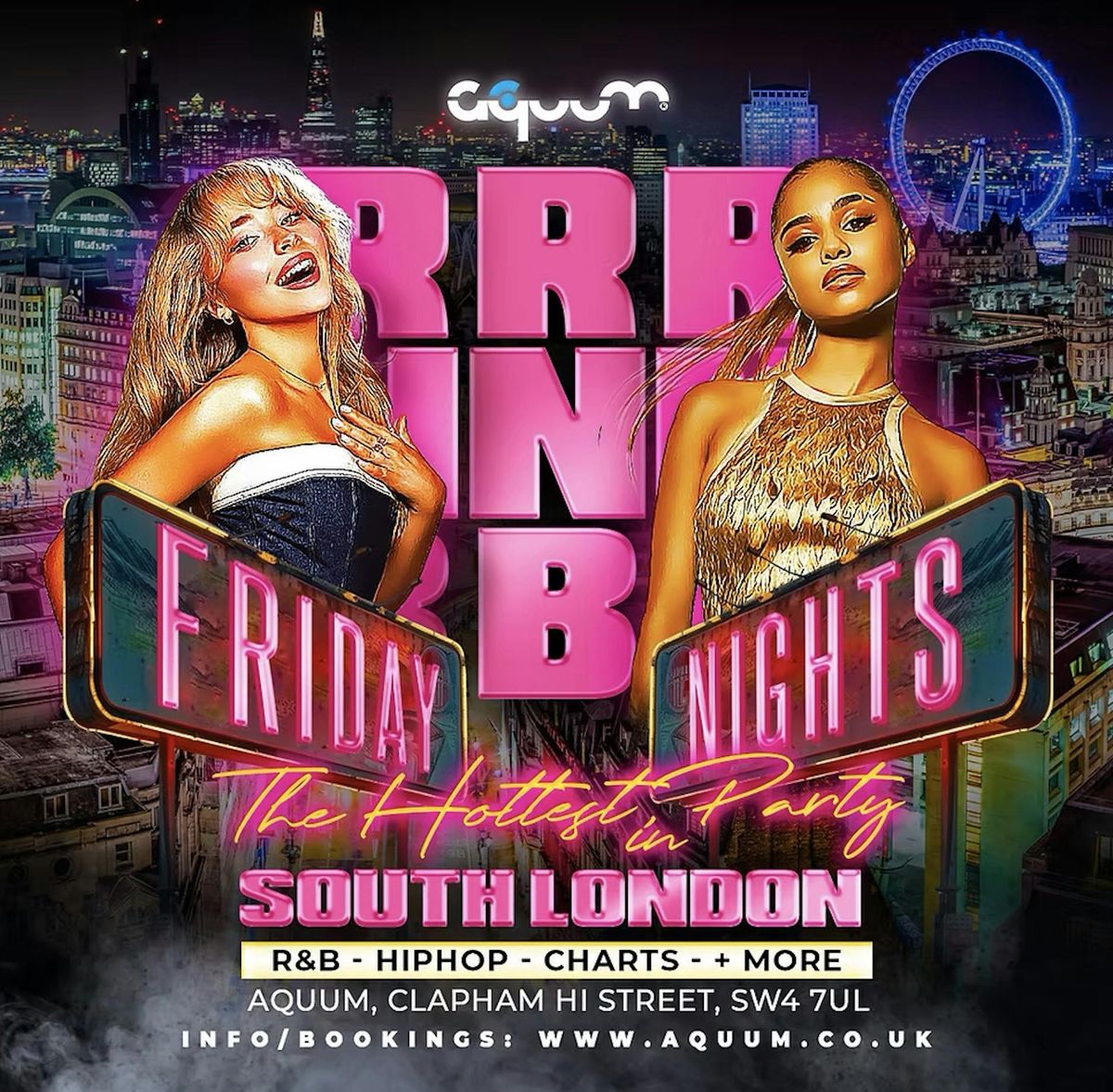 R&B Fridays @ Aquum Clapham // Old Skool R&B, Hip-Hop, Party Anthems // 4am CloseExperience a dazzling Friday night at Aquum, Clapham's premier nightlife destination. The evening starts with the lively vibe of bottomless dinners, setting the stage for a night filled with energy. As the clock strikes 10pm, the atmosphere shifts with DJs taking over, spinning the hottest tracks in commercial R&B and Hip Hop until the early hours of 3:30am. Whether you're there to enjoy the dynamic music, savour the meticulously crafted cocktails, or simply soak in the electrifying ambiance with friends, Aquum promises an unforgettable night out.