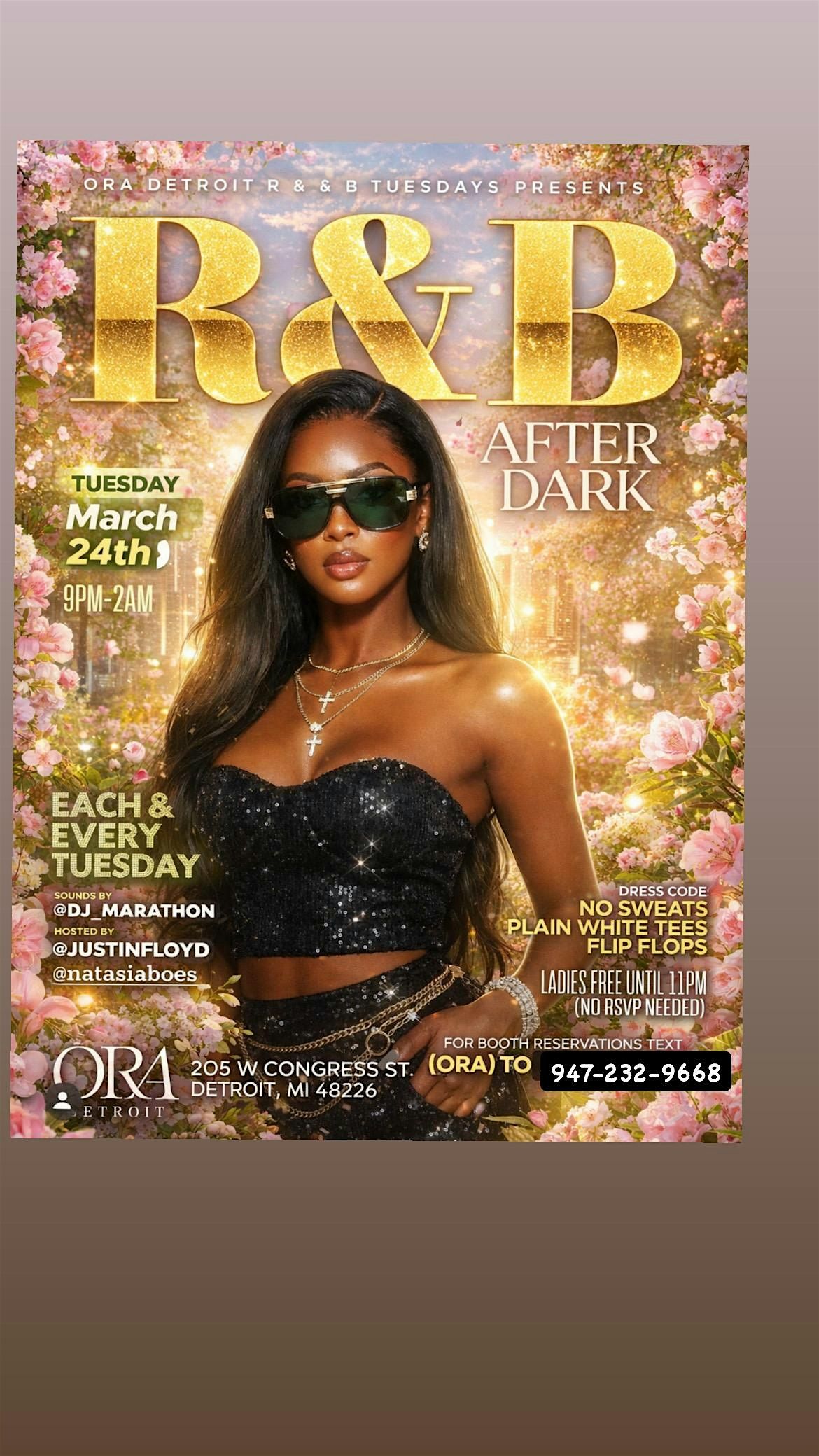 Get ready to vibe at ORA Detroit on March 24th 2026 at 9:00 PM (EST)! Join us for an unforgettable night filled with smooth R&B beats and good times. Whether you're coming to dance or just chill, this is the place to be. Bring your friends and let’s make Tuesday nights something to look forward to!