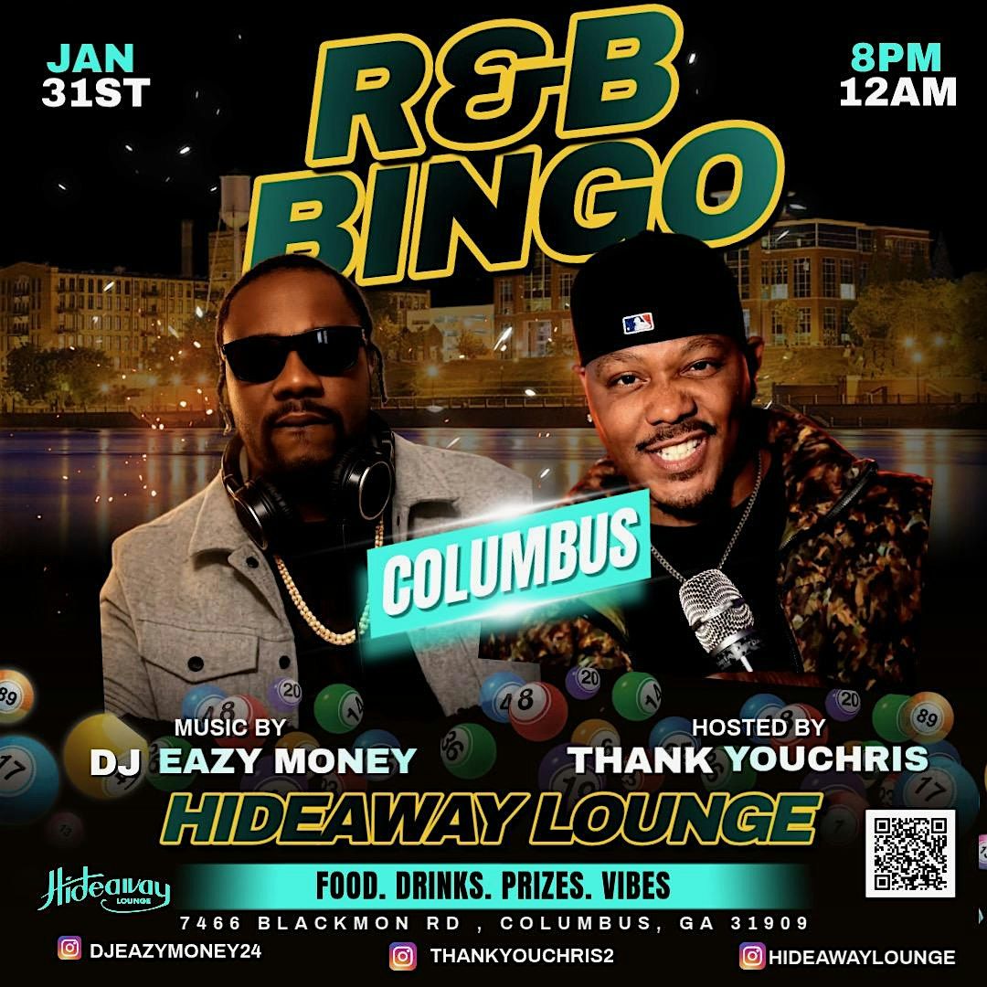 Welcome to R&B BiNGO Columbus GA! Get ready for a night of fun and laughter at our R&B Vs Trap Bingo event with comedian THANK YOU CHRIS! Join us at Hideaway Lounge on FRIDAY MARCH 27TH 2026 at 8:00 PM for a one-of-a-kind experience.
