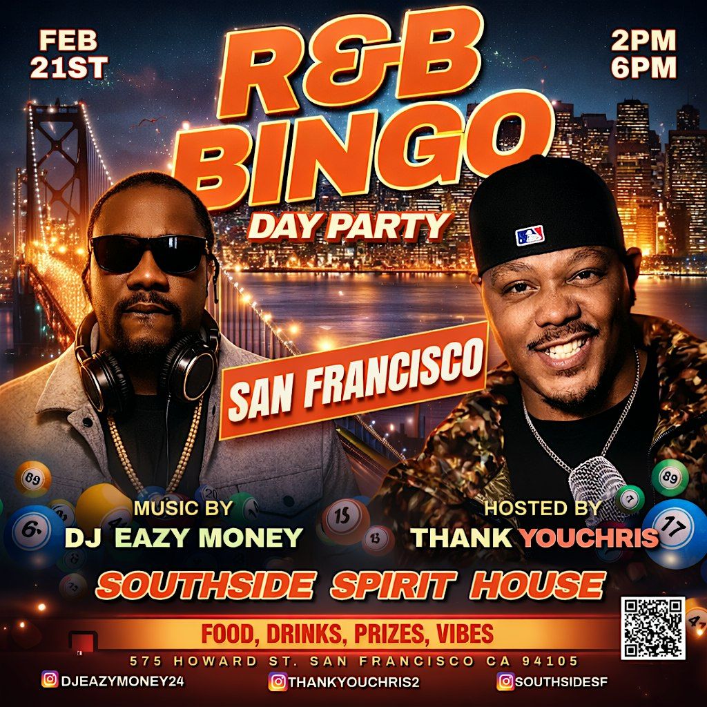 Welcome to R&B BiNGO OAKLAND! Get ready for a night of music, fun, and games at Southside Spirit House. Join us on Sat Feb 21st 2026 at 2pm for R&B Vs Trap Bingo with the one and only THANKYOUCHRIS. It's going to be a night to remember, so bring your friends and get ready to dance, sing, and win some awesome prizes. Don't miss out on this epic event!
