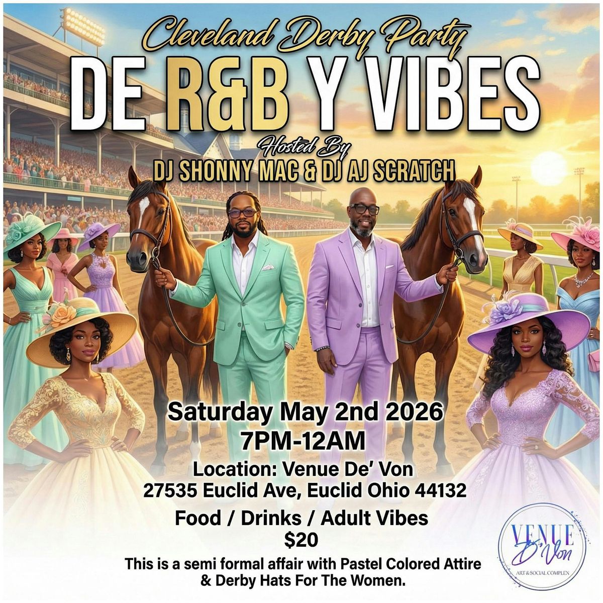 Join us for an in-person night filled with smooth beats, great vibes, and good company. Whether you're a derby fan or here for the R&B grooves, this party's got you covered! Dress to impress, bring your best moves, and let's make unforgettable memories together. Don't miss out on the ultimate R&B Derby Party experience!