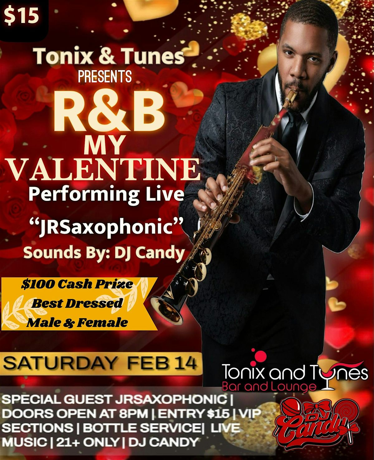 Get ready to vibe with the smoothest R&B beats this Valentine's Day. Hosted by DJ Candy with a special live performance from well know musician "JrSaxophonic". Whether you're flying solo or with your special someone, this in-person event promises good tunes, even better energy, and an unforgettable night. Come through, dance, and let the rhythm move you!