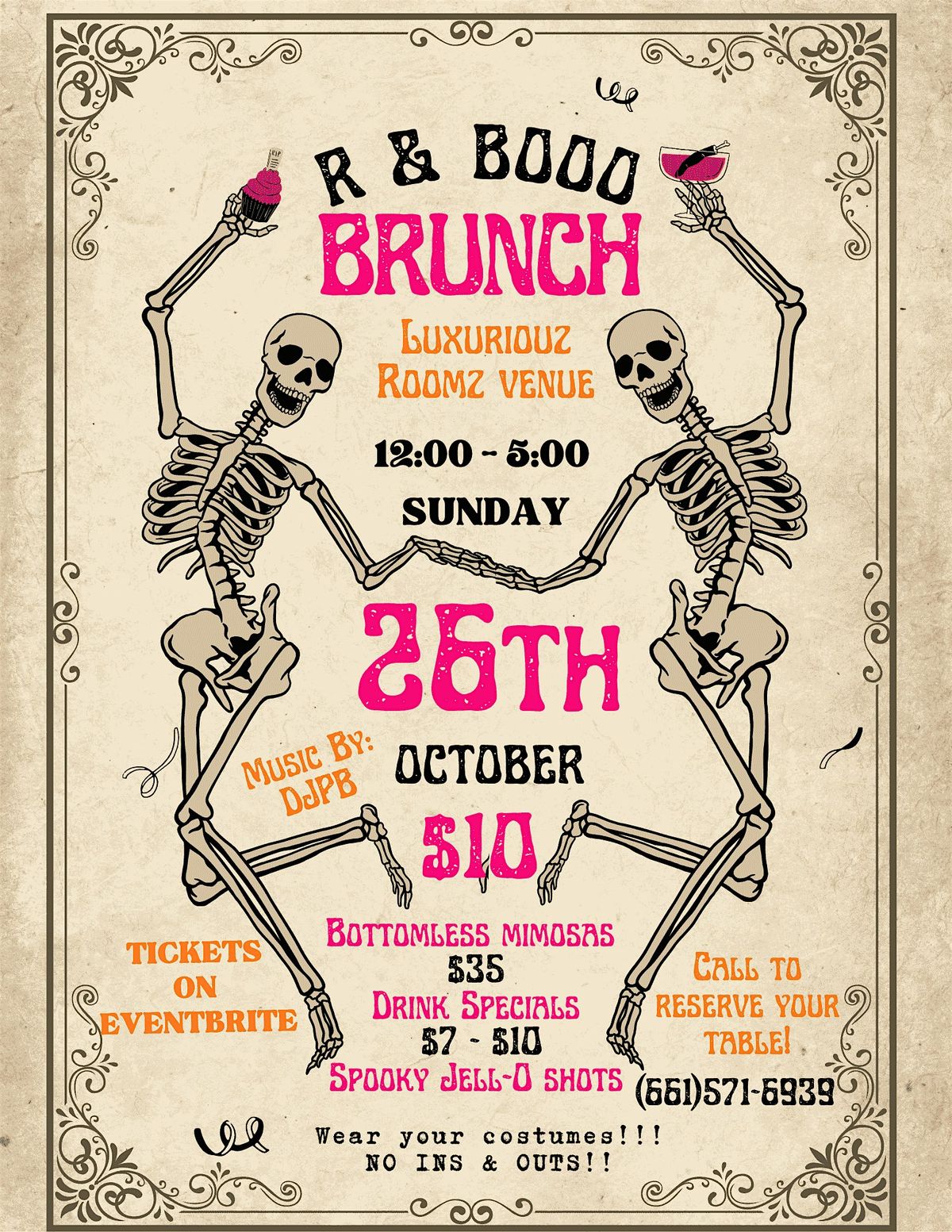 Come join us for a spooktacular brunch at the Luxuriouz Roomz Venue. Sip on boo-tiful cocktails, botttomless mimosas for 2 hrs and enjoy R&B,2000's music that will give you chills!