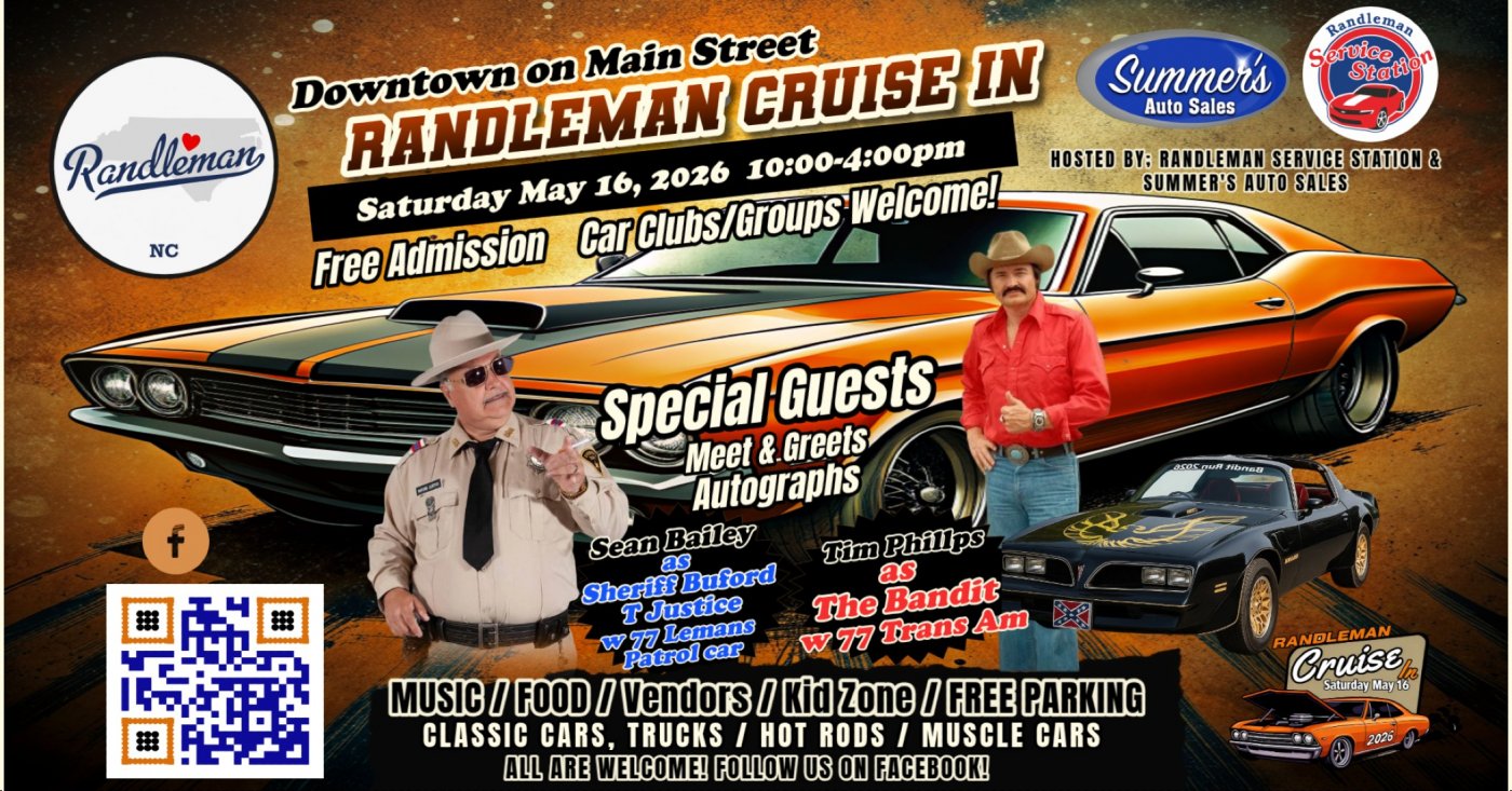 For updates follow the Randleman Cruise-In on social media or contact the event hosts at Summer’s Auto Sales and Randleman Service Station in downtown Randleman.