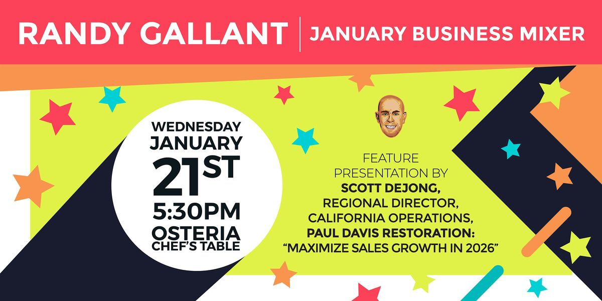 The Feature Presenter for January is Scott Dejong, Regional Director, California Operations for Paul Davis Restoration. The topic of his Presentation will be “Maximize Sales Growth in 2026:Building & Nuturing Valuable Relationships".