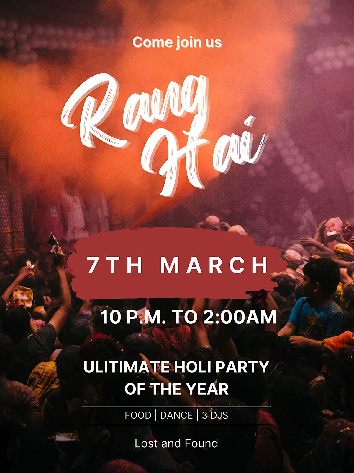 Get ready for a vibrant and unforgettable Holi celebration at Rang Barse Bollywood Night! Inspired by the colorful spirit of Bollywood and the joyful festival of Holi, this event brings together colors, music, food, and festive energy for a night full of fun and celebration.