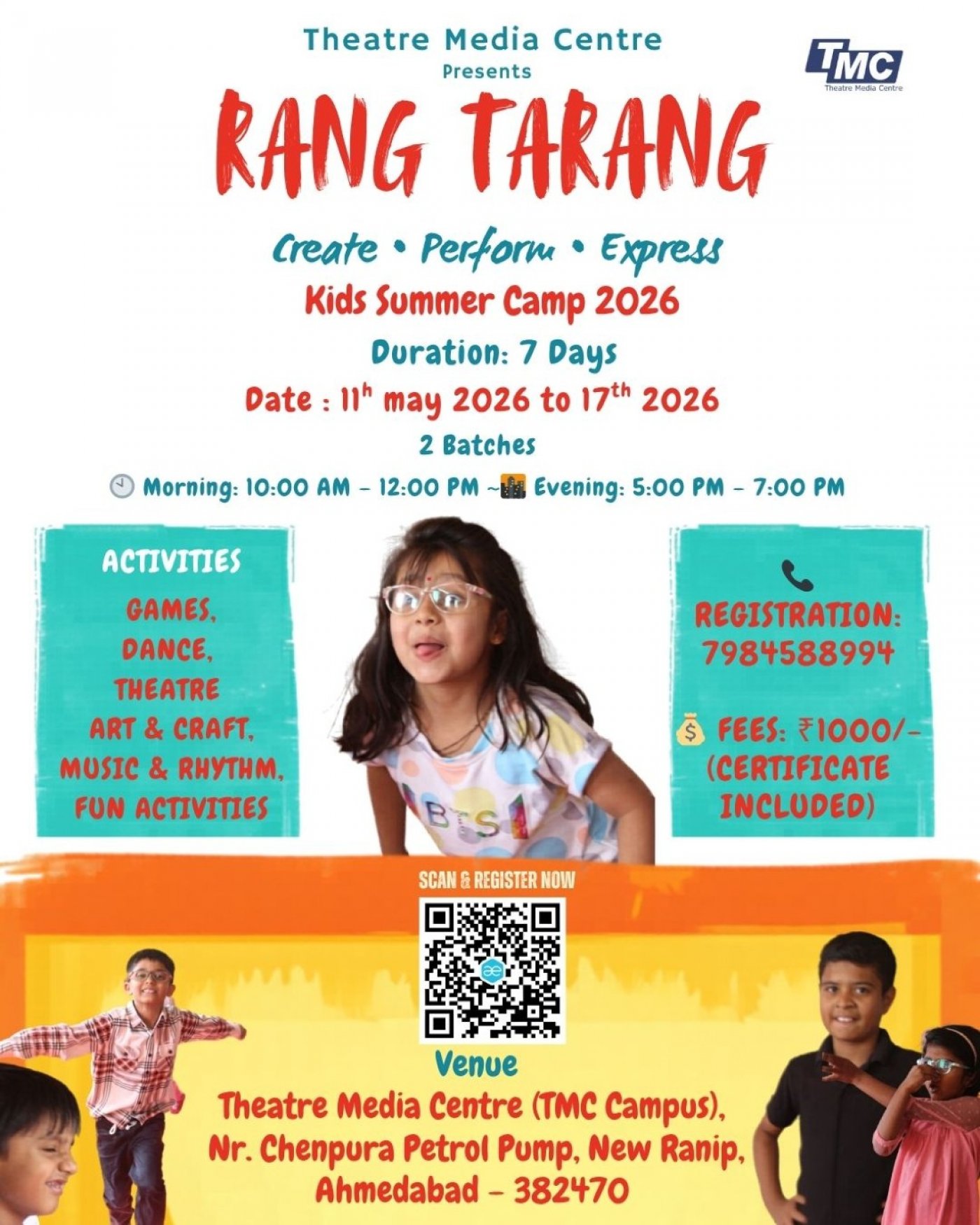 Theatre & Media Centre, TMC Campus, Chenpur Road, Near Kodiar Temple, New Ranip, opposite Muktidham, Kali, Ahmedabad, Gujarat 382470, IndiaINR 1000.00