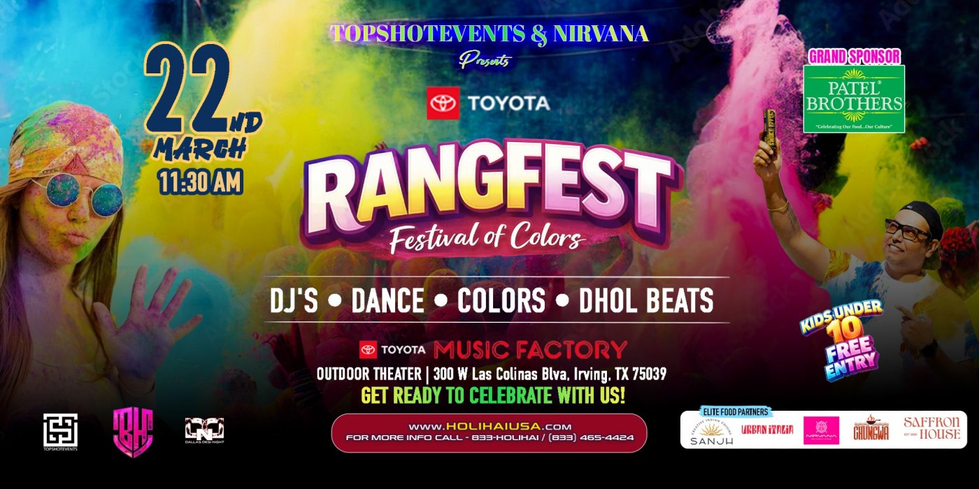 Get ready for Dallas’s most vibrant Holi-style celebration! RANGFEST 2026 is the ultimate Festival of Colors with music, dance, food, and unforgettable vibes with friends & family.