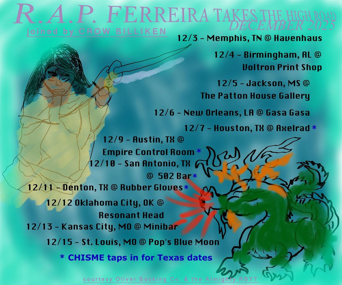 R.A.P. Ferreira takes the high road. His ambitions are an ever widening vocabulary, a full gas tank, the next tour’s itinerary. The rapper is evolving as you doomscroll. The years go by and he is becoming more bluesman, less Redman. Ferreira’s sound on slide guitar is gaining renown. Taking the high road, he ventures through the American South in support of his brand new album with Kenny Segal, “the Night Green Side of It”. The record is a reflection of 14 years relentless touring and releasing, researching and developing on the edges of the underground sound. These engagements promise to be a master class of 100 years of Black American music. From country blues to jazz rap, Ferreira is hitting targets no other artist alive sees.