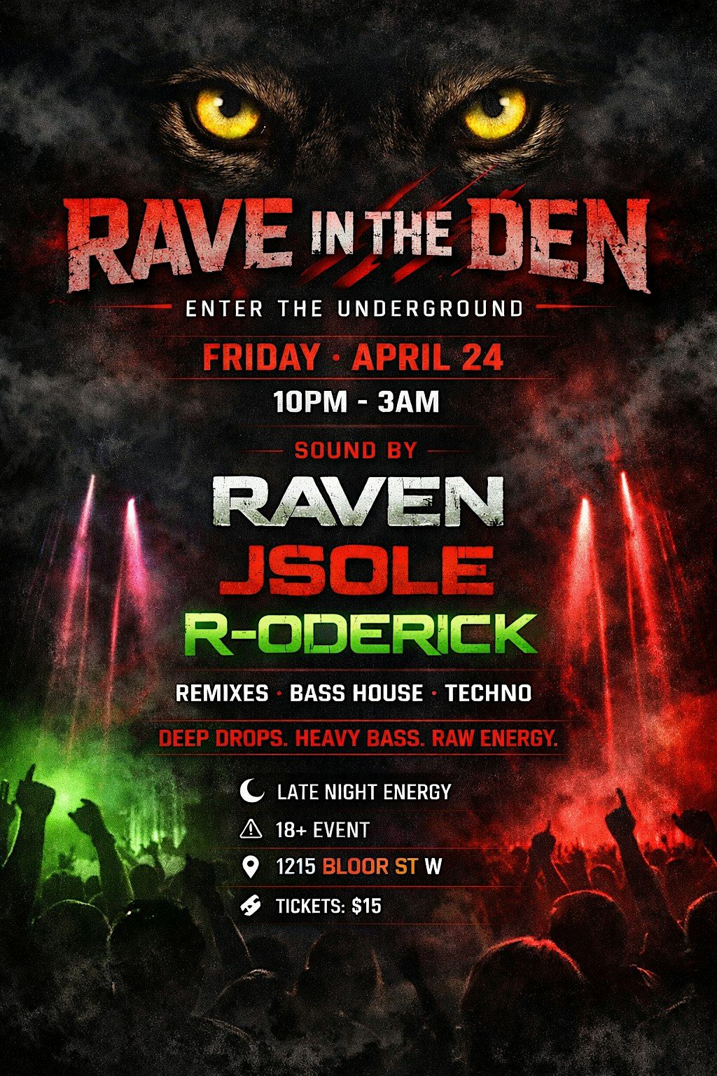 Taking over 1215 Bloor St W on Friday, April 24 from 10PM to 3AM, this 18+ event delivers a stacked night of remixes, bass house, and techno powered by DJ's Raven, JSOLe, and R-Oderick.