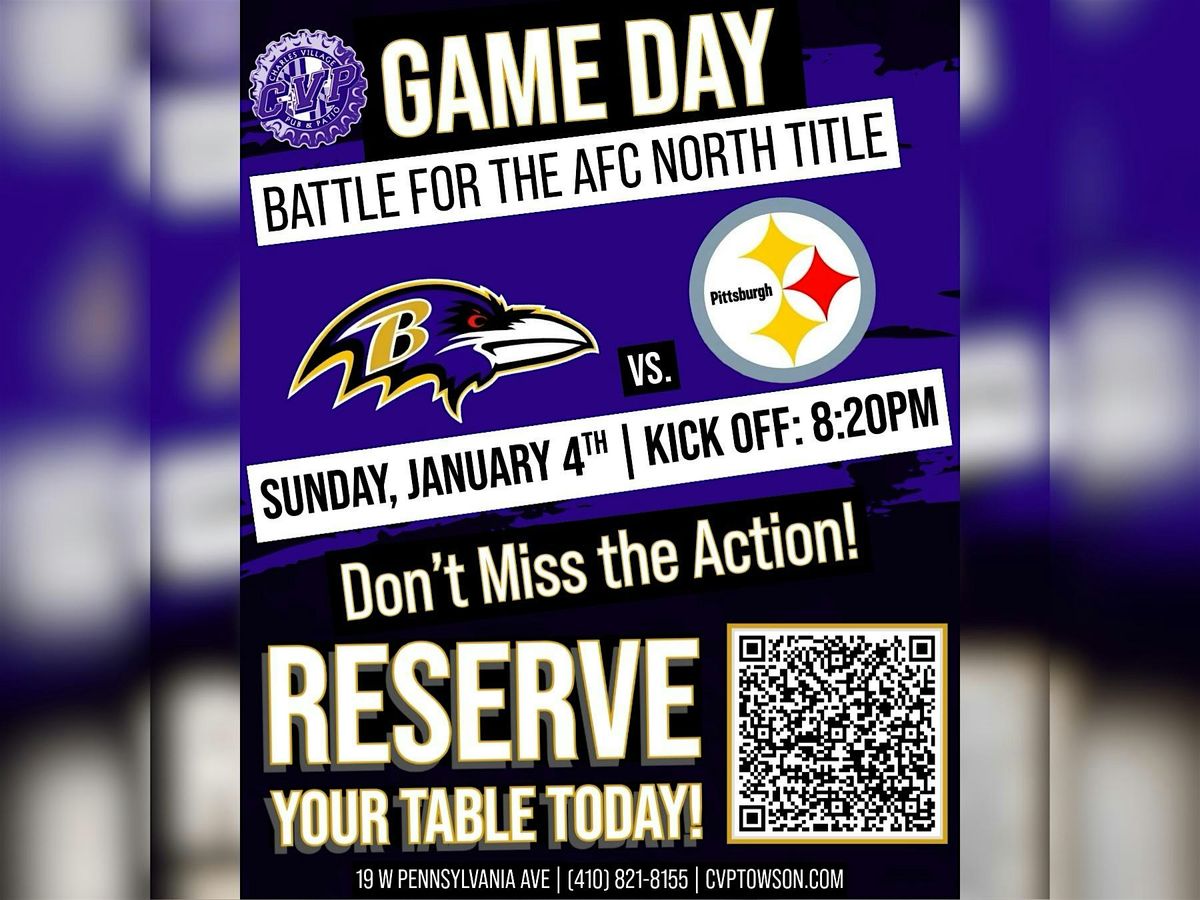 Get ready for an epic showdown as the Ravens take on the Steelers in the ultimate AFC North Title Game! Join us to feel the electric atmosphere, cheer for your team, and witness some intense football action. It's the clash you can't miss—bring your friends and be part of the excitement live!