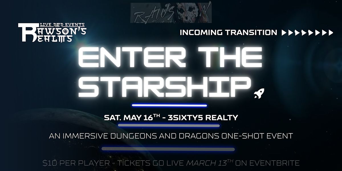 Get ready for an epic adventure at 3Sixty5 Realty! Join us on May 16, 2026 at 12:00 PM (Eastern Time) for Rawson's Realms III: Enter The Starship. A sci-fi themed Dungeons and Dragons Immersive OneShot Experience is coming to Southgate, MI on May 16th! Tickets are $10! 3 Timeslots, 6 players per time, and they go live at 10AM on Friday, Marc̶h̶ ̶1̸3̴t̵h̷ on @eventbrite, and it is going to be a CAN’T MISS REALM!