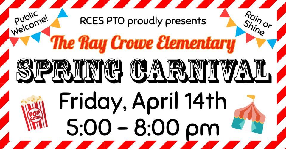 Ray Crowe Elementary PTO is excited to host the inaugural Ray Crowe Elementary Spring Carnival on Friday, April 14th from 5:00 to 8:00pm. This will be a fun event for our students and their families as well as the local community. The carnival will include games, a cake walk, inflatables, face painting, a dunking booth, a prize raffle, concessions, and more fun activities. All proceeds from the event will benefit the students, teachers, and staff of Ray Crowe Elementary.