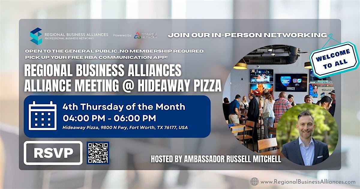 Join the RBA Alliance community for our monthly networking meetup at Hideaway Pizza, hosted by Ambassador Russell Mitchell. This relaxed and welcoming event brings together entrepreneurs, professionals, and community leaders to connect, collaborate, and grow.