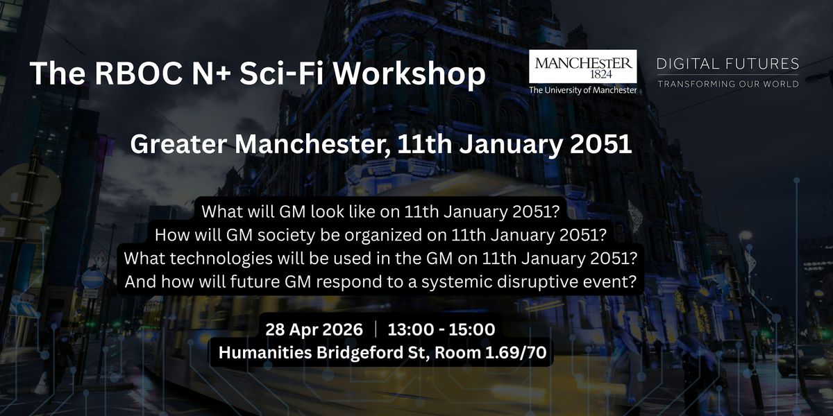 This workshop, part of the RBOC N+ (Resilience Beyond Observed Capabilities Network) project, brings together sci-fi creators, urban thinkers, and futurists to collaboratively imagine possible futures for Greater Manchester.