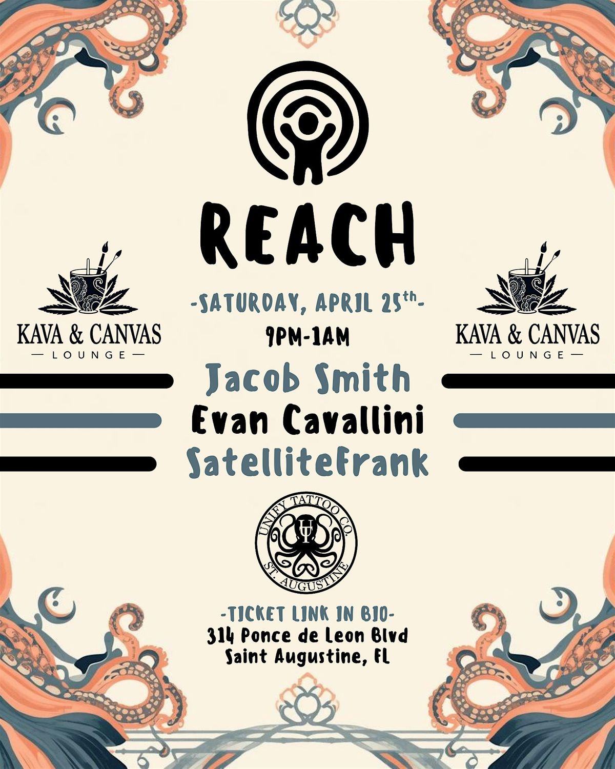 Join us for our next installment of "REACH" at Kava & Canvas nestled inside of Unify Tattoo Company on Saturday, April 25th! 9pm-1amAbout this Event