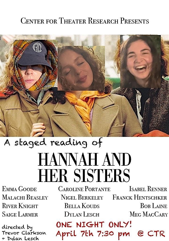 Originally starring Mia Farrow, Diane Wiest, Michael Caine, Carrie Fisher and many more. This academy award winning screenplay weaves together the lives of three sisters living in New York — Hannah, Lee, and Holly — as they navigate love, longing, and self-discovery over two eventful years. Rich with wit, warmth, and emotional depth, Hannah and Her Sisters remains one of cinema's most celebrated portraits of family and the complicated bonds that hold us together.