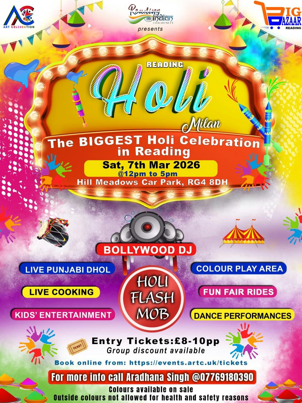 Get ready to celebrate Holi, the BIGGEST celebration in Reading * Bollywood DJ* Live Dhol* Holi Games* Kids activities* Dance Performances* Variety of Food and trade Stalls