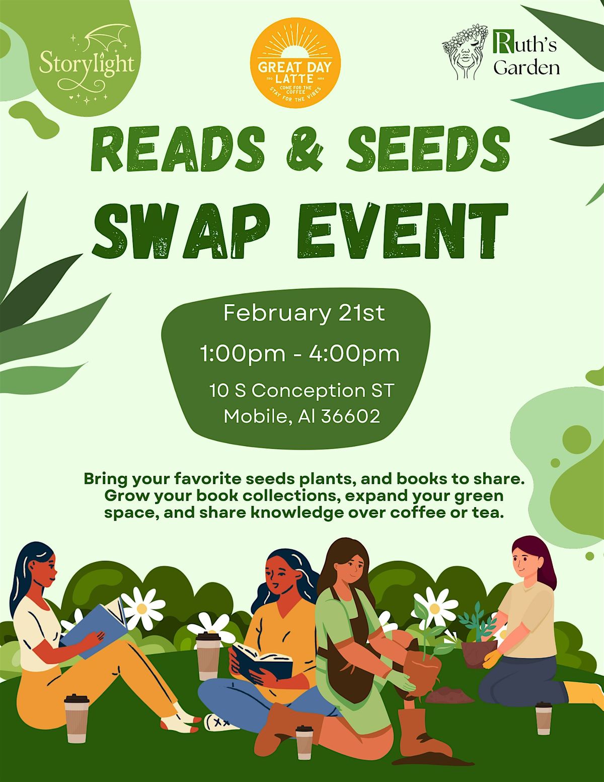 Join us for a relaxed, fun social where you can swap books, swap seeds, and connect with fellow book and plant lovers while enjoying coffee and drinks from Great Day Latte.