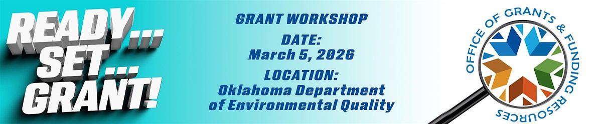 Welcome to the Ready... Set... Grant... Workshop happening at the Department of Environmental Quality! Join us on March 5, 2026 at 8:00 AM (Central Time) for a free informative session on grant writing. Whether you're new to the process or looking to enhance your skills, this workshop is perfect for you. Get ready to learn valuable tips and tricks to secure funding for your projects. Don't miss out on this opportunity to boost your grant writing abilities. Sign up now, only 50 seats available. Lunch provided by Oklahoma Rural Water Association.