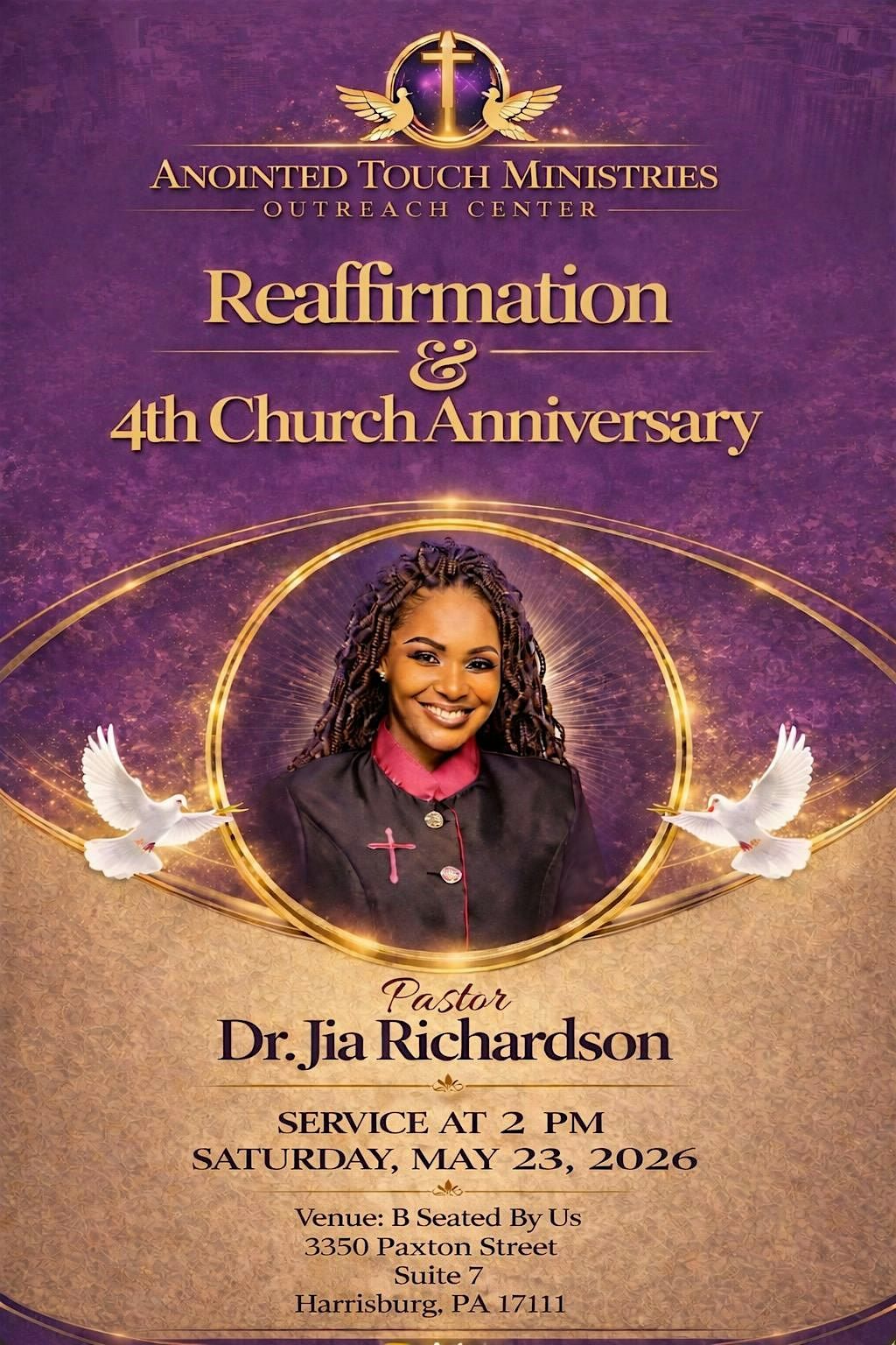 Join us in person for a special celebration with Pastor, Dr. Jia Richardson and the Anointed Touch Ministries Outreach Family! It’s not just any service — we’re marking our 4th anniversary and coming together for a powerful reaffirmation. Come experience inspiring moments, uplifting worship, and a warm community vibe. Don’t miss out on this meaningful gathering. See you there!